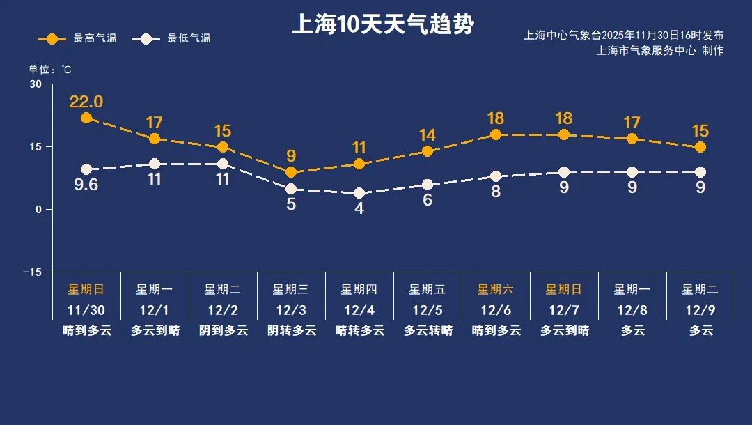 周二至周三,上海有一次较强冷空气过程,伴有大风和明显降温天气。周三气温降至个位数,全天仅5℃至9℃。周四早晨,上海受冷空气和辐射降温叠加影响,市区最低气温降至4℃,部分郊区最低气温或在冰点以下,是近期气温低点。双休日有望再迎“小阳春”体感。